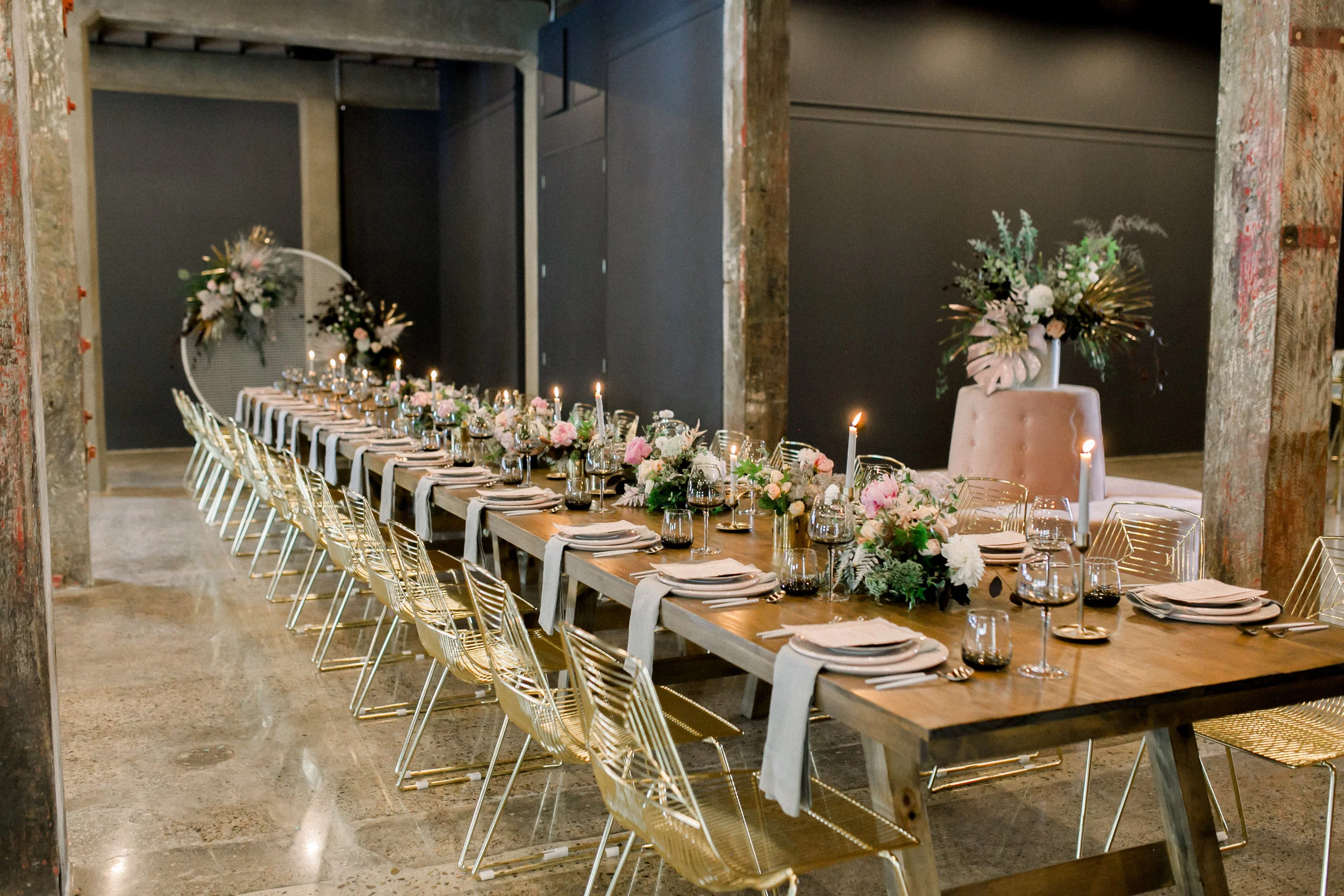 Aztec gold feature chairs were in stark contrast to the long wooden reception banquet tables. Hints of gold, pink and grey complement the venue’s dark grey and exposed brick walls. Blush coloured flowers gave the look a sweet and playful twist.