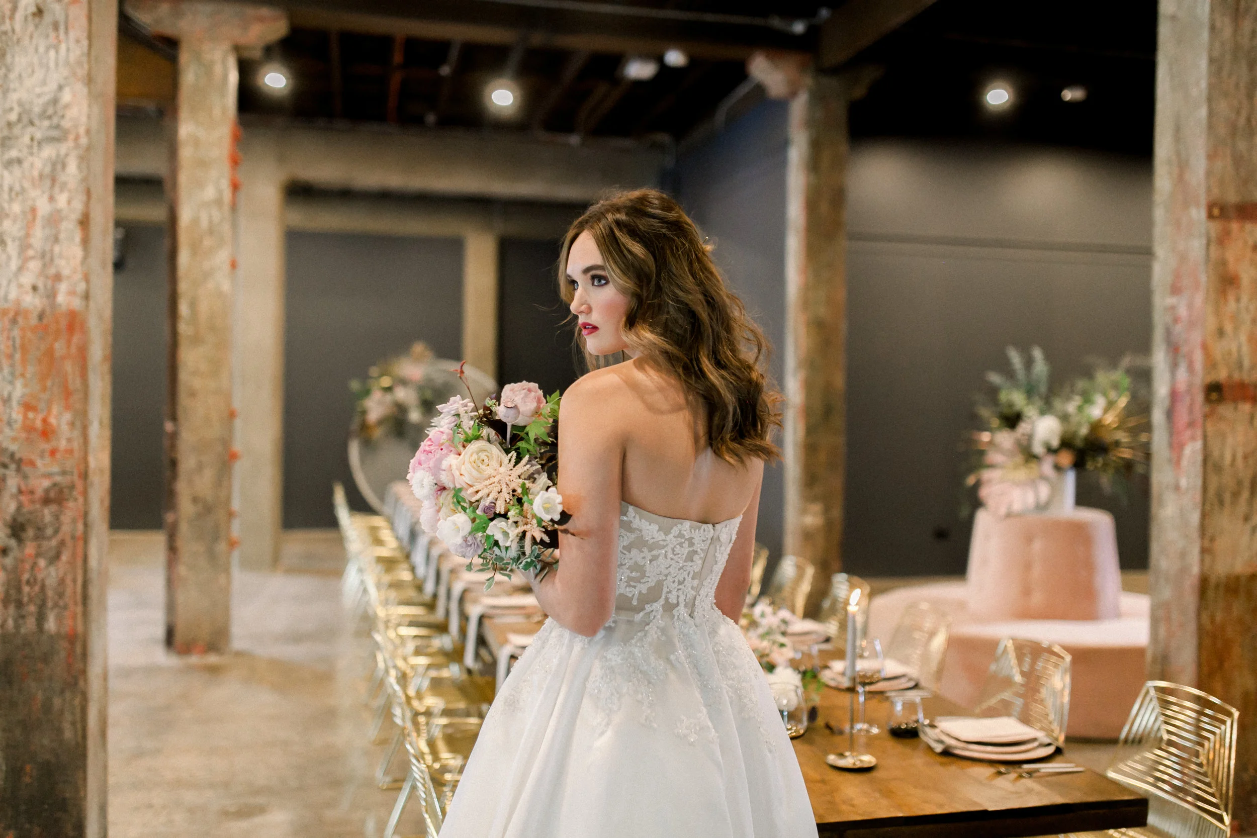 Modern meets art deco for this styled shoot where whimsical floral arrangements and feminine touches of gold and blush accents are contrasted with The Lushington’s polished concrete floors, exposed beams and high ceilings. Be inspired by this styling, a compelling mix of contemporary and old world charm.