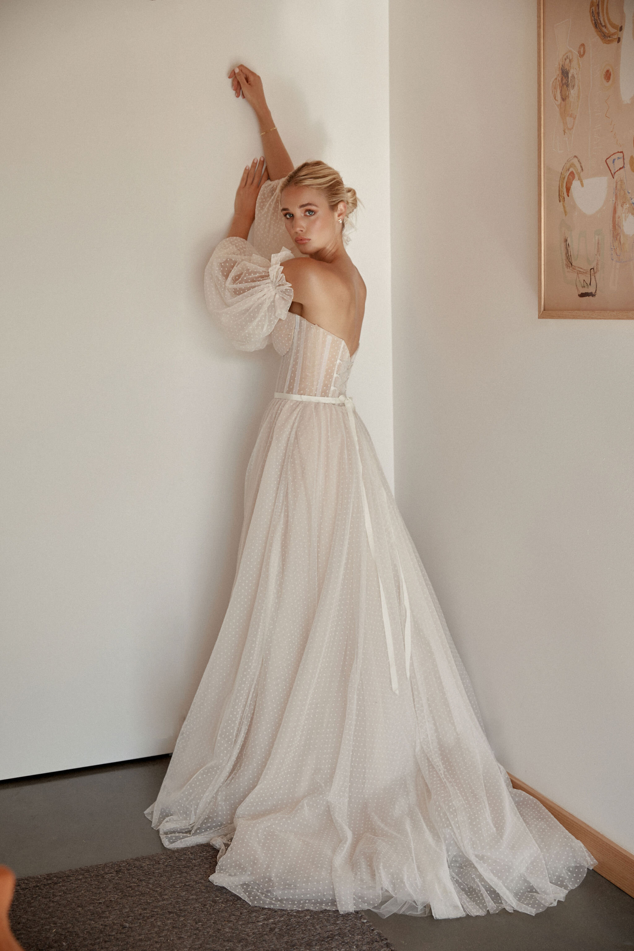 Step into the light with clouds of latte-hued polka dot tulle, structured honeycomb mesh and scattered seed pearls, corseted waists and dramatic trains. Statement sleeve shapes hero this collection, elevating your wedding day look to something you could only dream of.
