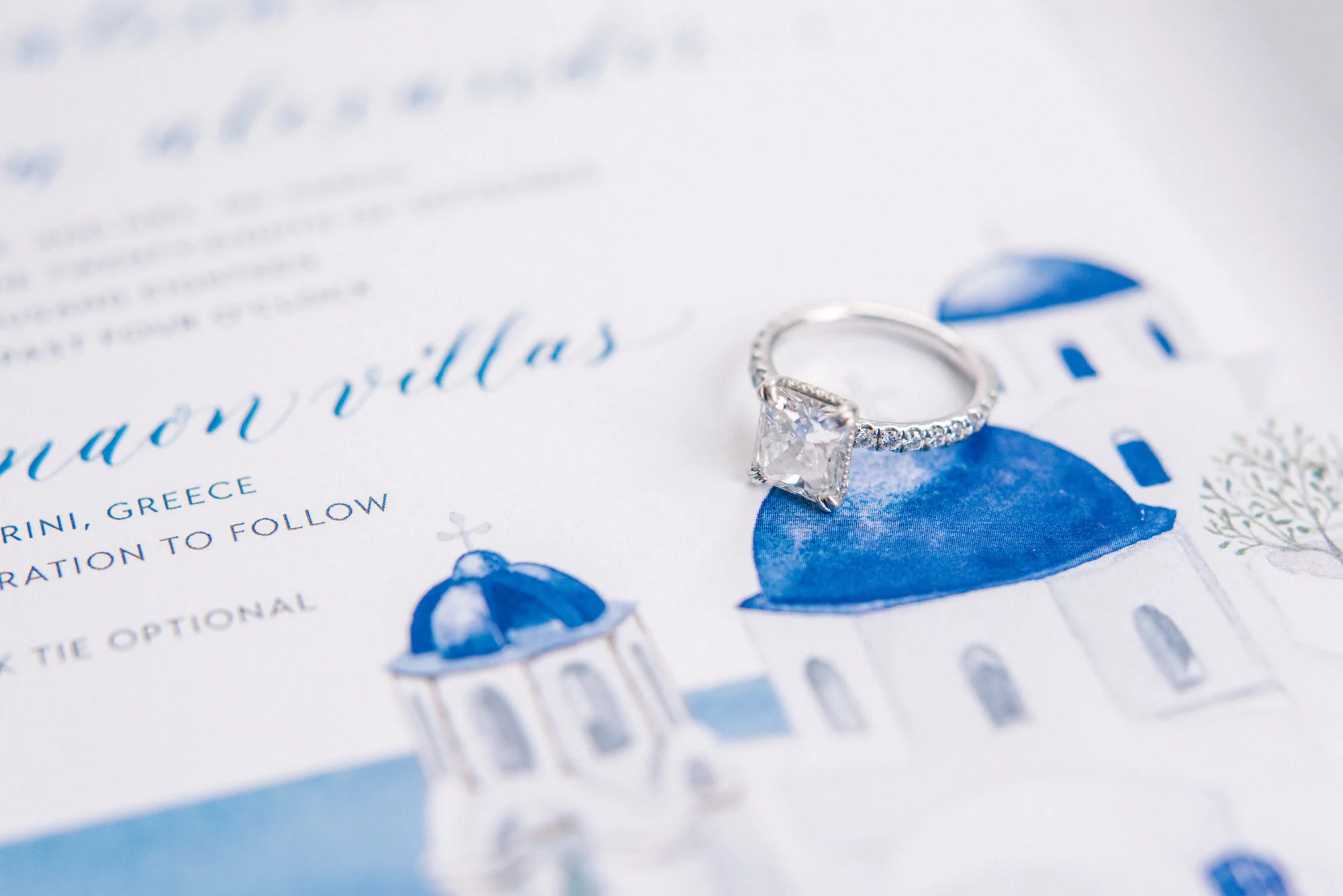 YOU’RE INVITED Invitations were beautiful custom creations by Studio Luzance which featured Santorini’s famous caldera-edge clifftops and blue domed churches. Guests took home traditional evil eye charms and delicious smelling Santorini-made soaps that were made for the wedding.