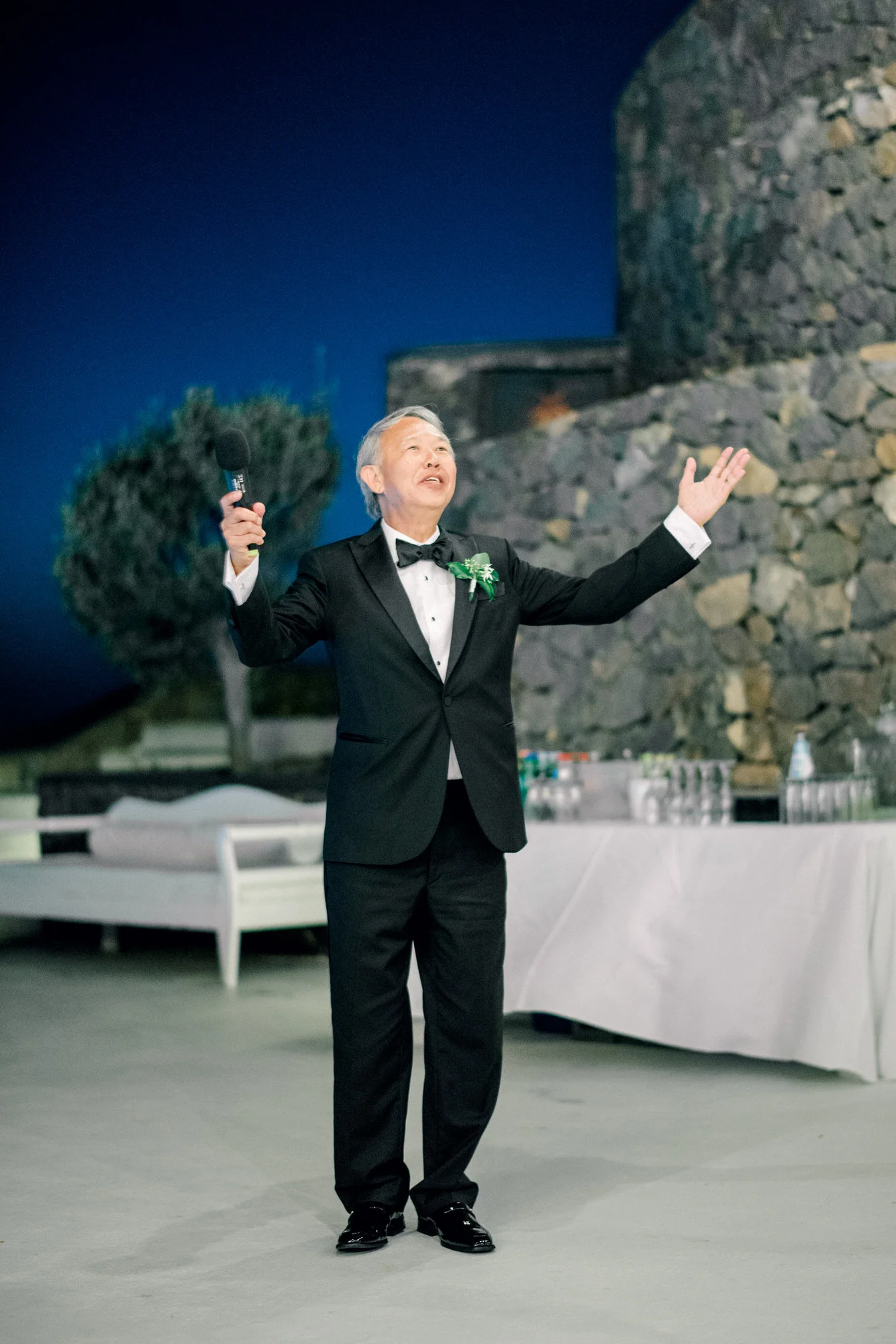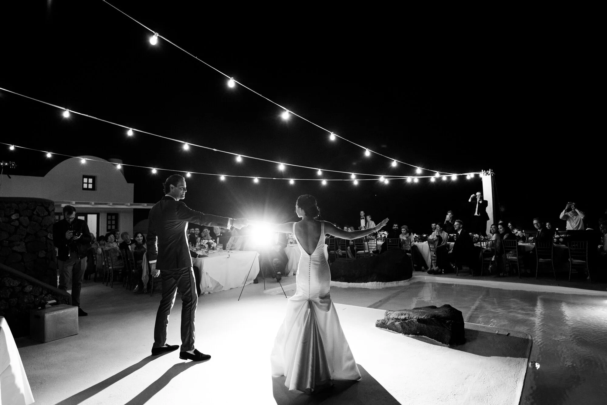 "On the morning of the wedding, we woke up to a downpour, which threatened to cancel all of our wedding day plans. It sounded dramatic, but we actually had no back-up plan if it rained. It rarely ever rains in September in Santorini. Having friends stranded on different islands and waking up to a deluge was more than nerve-wracking, it was extremely stressful." Thankfully, their good luck hadn’t run out and by midday the skies opened up to reveal perfectly blue skies and sun. "Our day ended up being perfect as the photos show, complete with personal vows, Greek dancing, and fireworks."